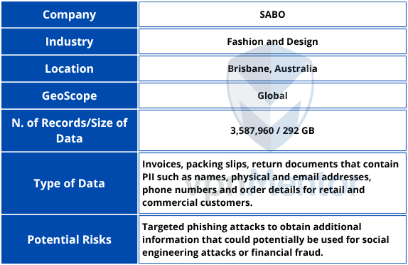 Given the information in the internal files, the records appeared to belong to a Brisbane, Australia-based fashion company called SABO. It designs and sells an exclusive collection of clothing, shoes, swimwear, sleepwear and formal wear. SABO sells their products at physical locations across Australia, but it also does online sales with worldwide shipments.